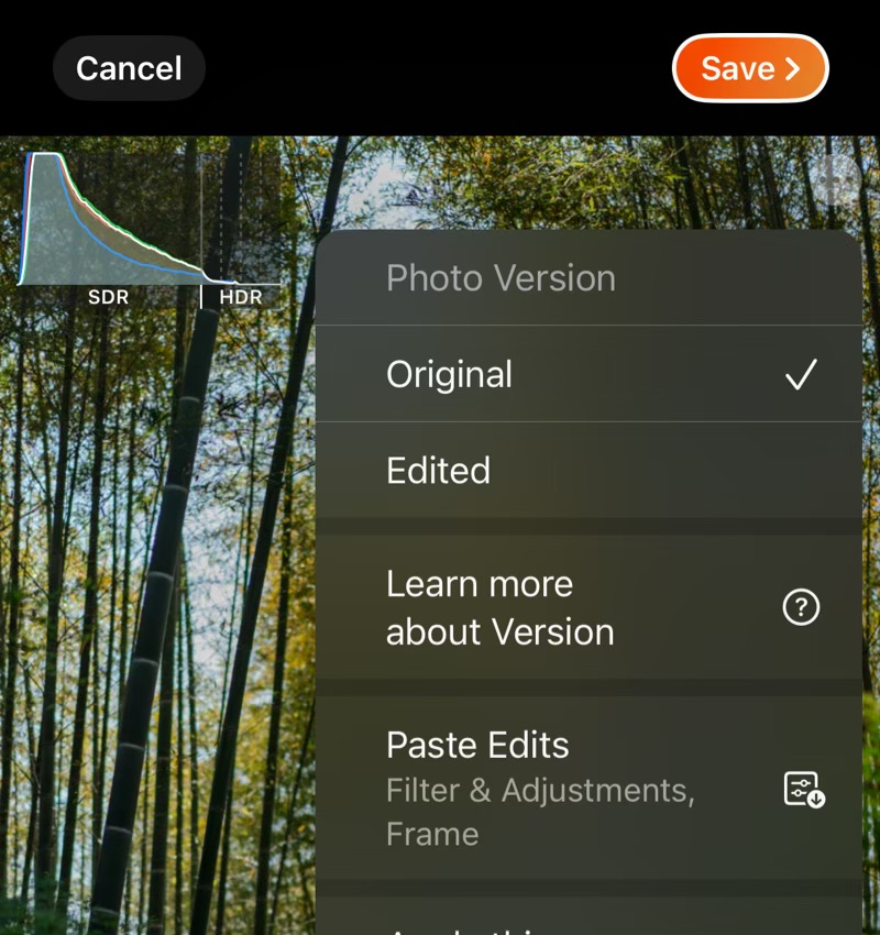 You can also paste Edits associated with this photo in PhotonCam’s editor. This feature can be accessed via the “…” menu in the editor. It helps you restore the Edits when editing the “Original” version of the photo.