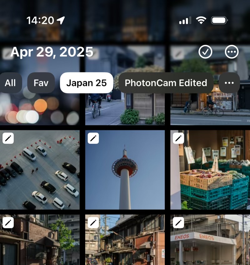 If you organize photos into different albums in the iOS Photos app, now PhotonCam can help you pin those albums in the app to find photos quickly. Tap the "..." button at the end of the album list to select albums to pin.