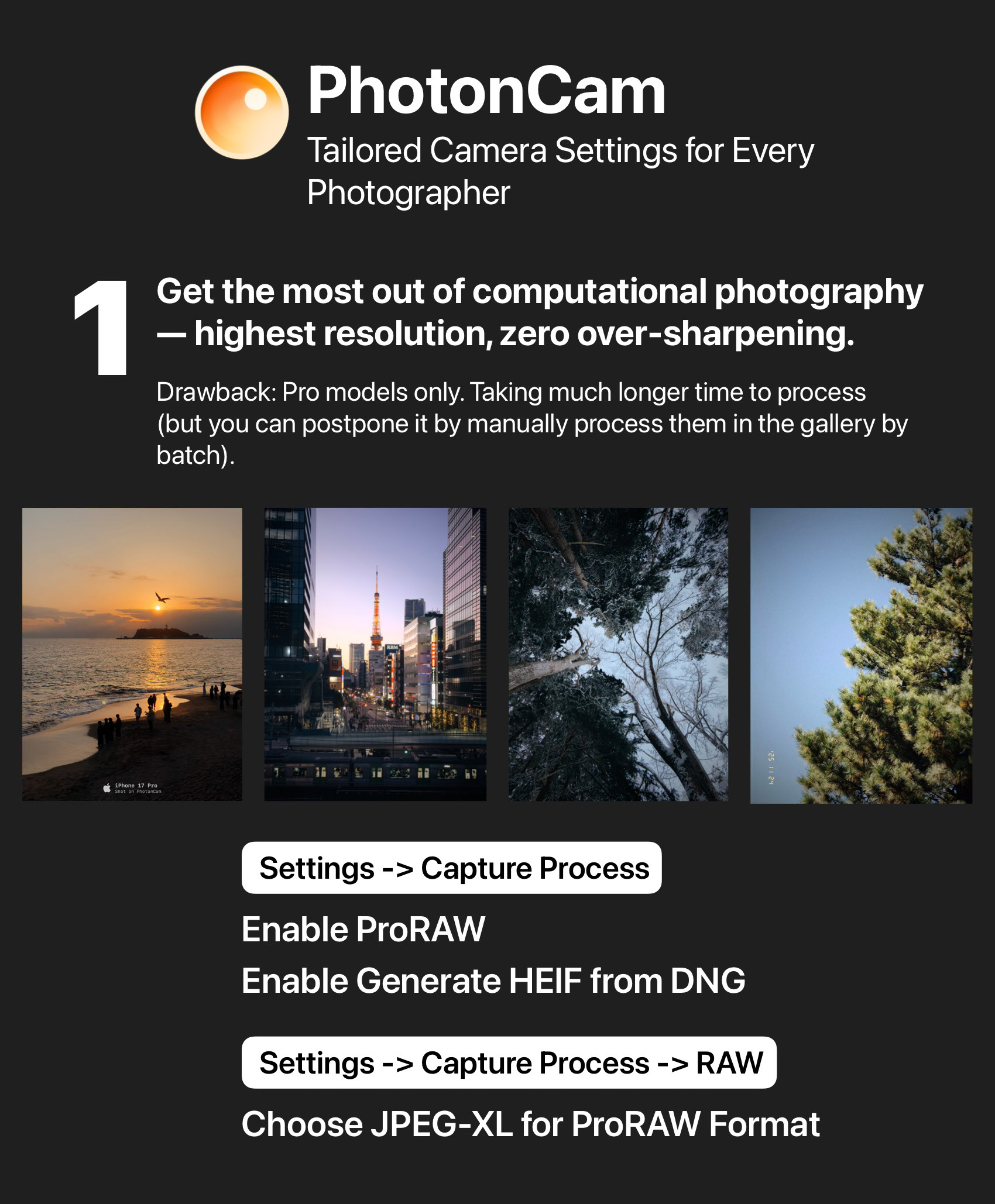 Maximize computational photography — highest resolution output with over-sharpening removed. Key settings: Enable ProRAW and Generate HEIF from DNG.