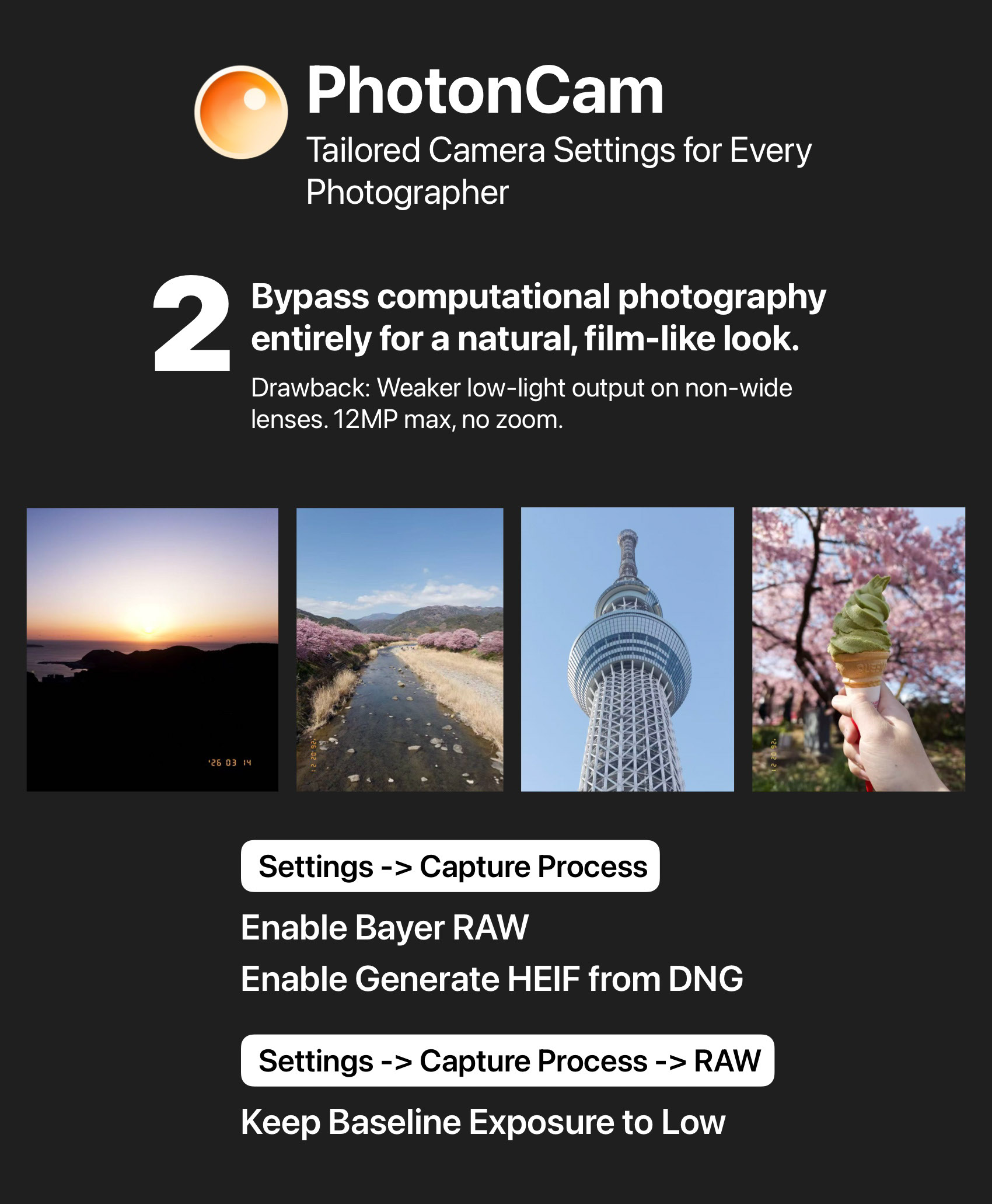 Bypass computational photography entirely for a natural, true-to-camera look. Key settings: Enable BayerRAW and Generate HEIF from DNG; keep baseline exposure at "Low."