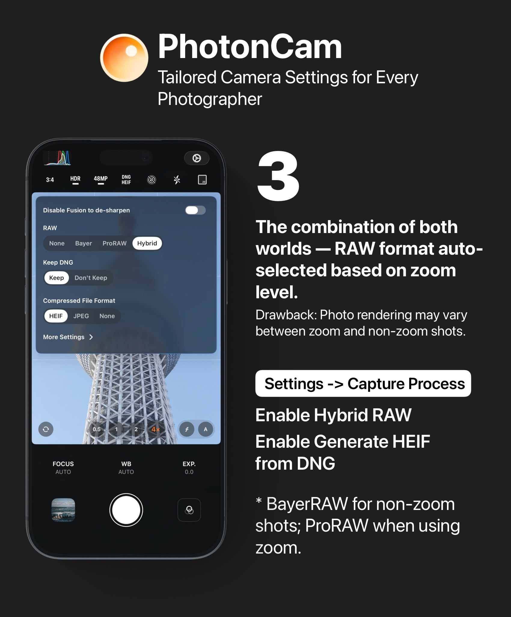 Get the best of both worlds. Key settings: Enable Hybrid RAW — BayerRAW for non-zoom shots, ProRAW when zooming in. After all, getting the shot comes before judging it.