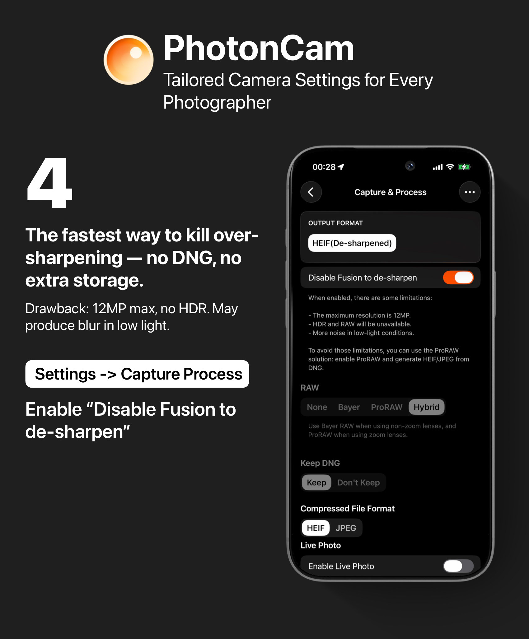 One tradeoff: shooting at 48MP means a longer capture-to-save time (around 4–5 seconds). Alternatively, you can disable "Generate HEIF from DNG" and batch-reprocess your shots later via multi-select in PhotonCam — you'll get the same de-sharpening result. Note: Pro models only.