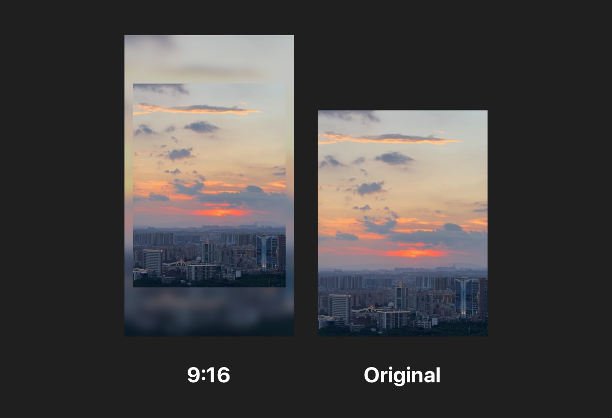 Instagram Stories only supports portrait videos, so we specifically support 9:16 video output. Regardless of the original photo's aspect ratio, it will be centered within a 9:16 "frame" with the background filled with a blur effect, though you can also choose to fill with white or black.