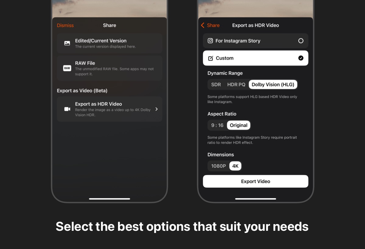 The exported video will be a still frame of the photo, suitable for uploading to platforms that support HDR video, such as Instagram, Rednote, or TikTok. The reason for providing different export options is that different platforms support different HDR formats and video specifications. Based on my experience, here are my conclusions: