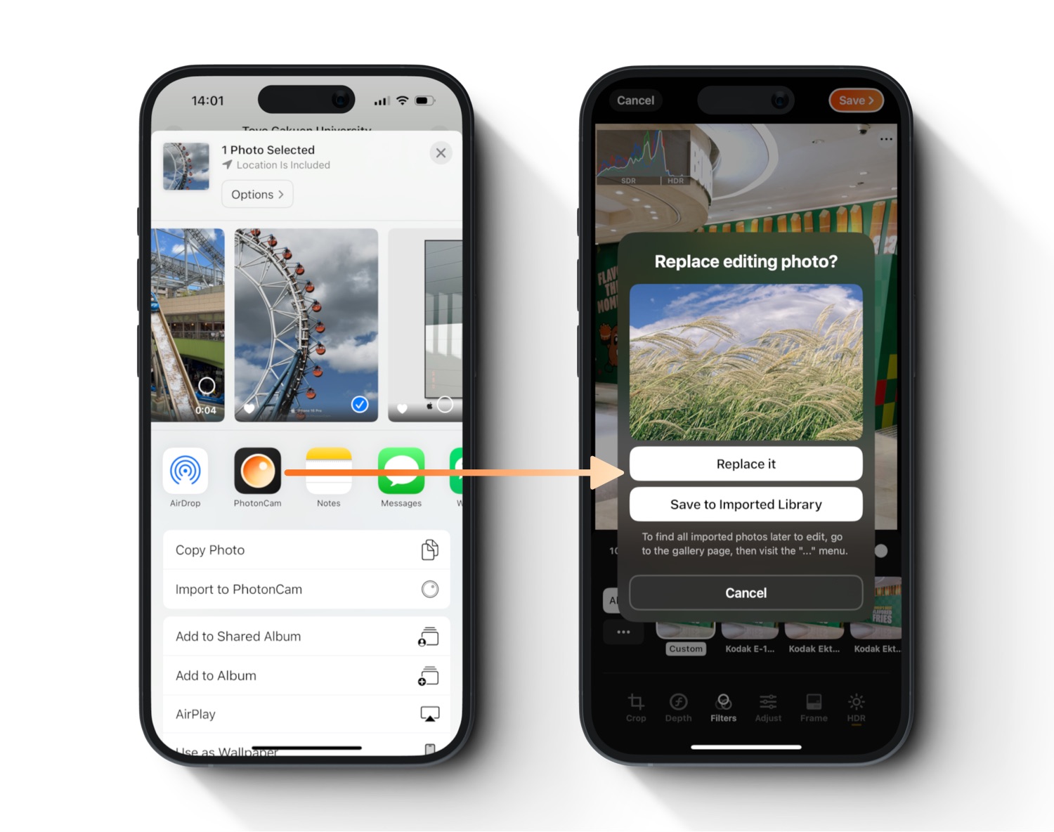 If you are currently editing a photo in PhotonCam, you will be asked whether to replace the current editing photo without losing the adjustments you just made, or you can save it to the internal library for later editing.