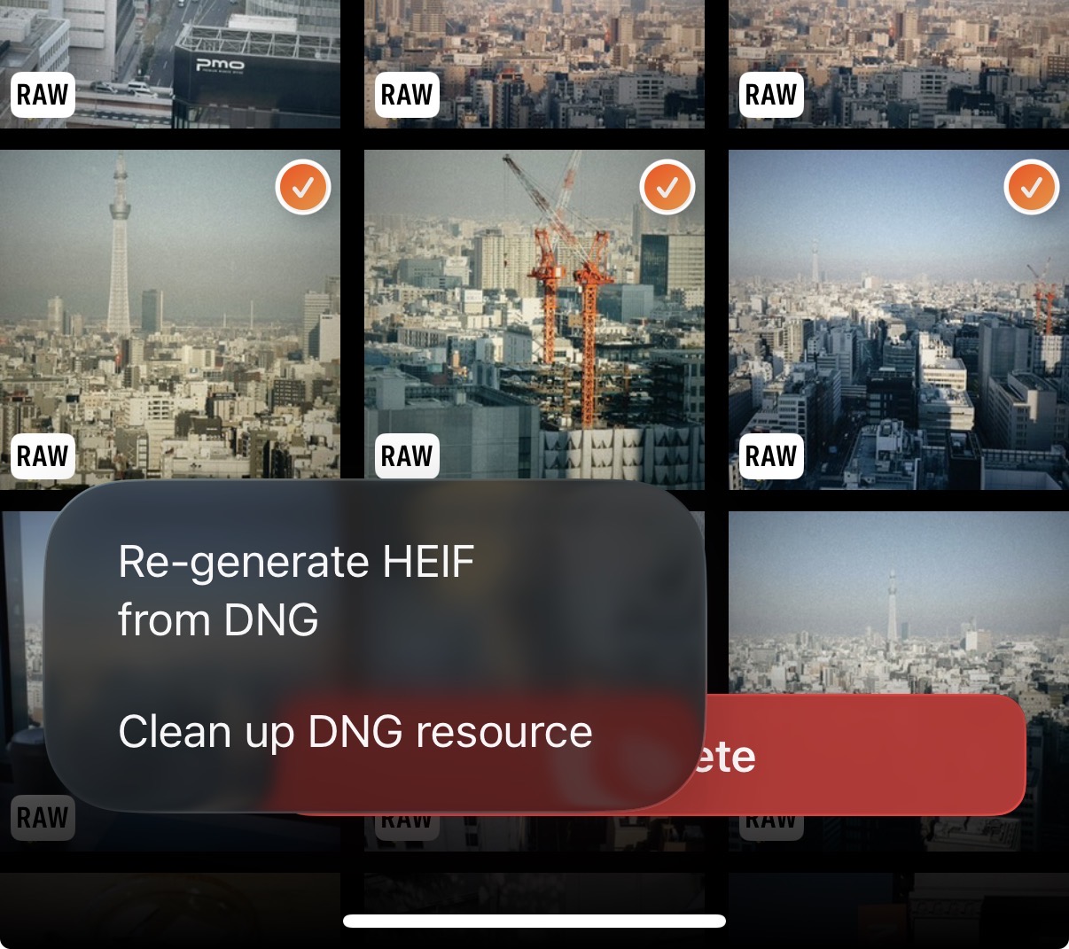 - For RAW + HEIF/JPEG photos, open the PhotonCam gallery, multi-select photos with the RAW badge, then use the “Re-generate HEIF from DNG” option in the bottom “…” menu.