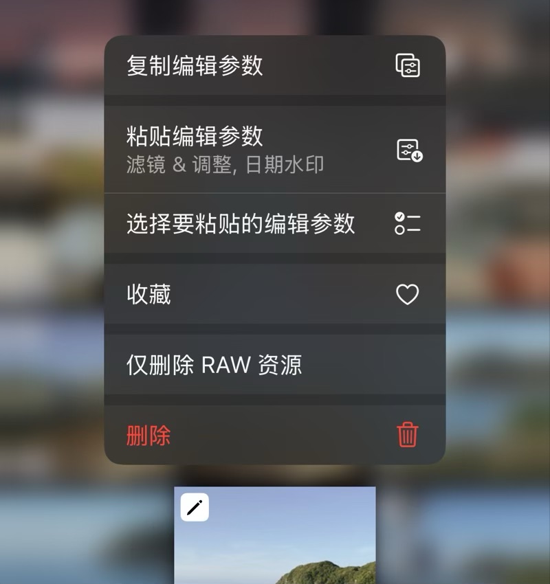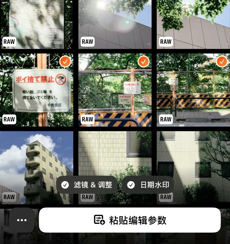 长按一个照片来粘贴编辑参数,或者进入选择模式,来批量粘贴编辑参数。