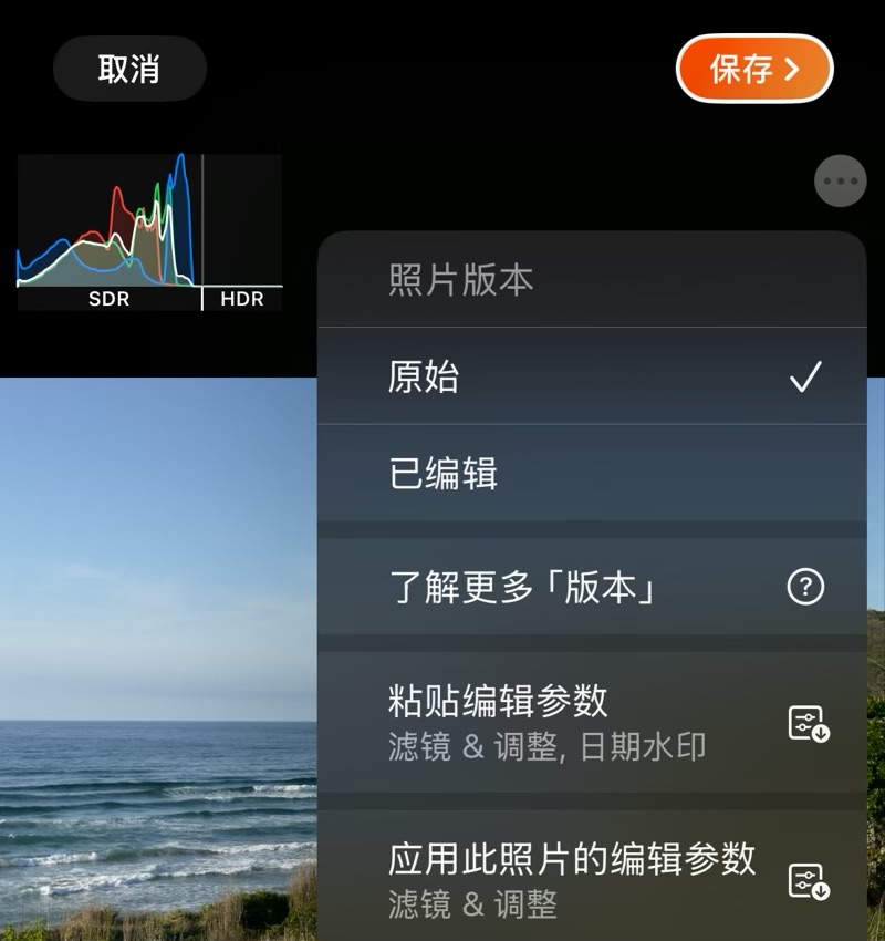 在 app 编辑器内编辑的时候,你可以基于「原始版本」的照片,来粘贴已保存的调节参数,这样你可以基于该调节参数上在「原始版本」的基础上重新编辑照片。