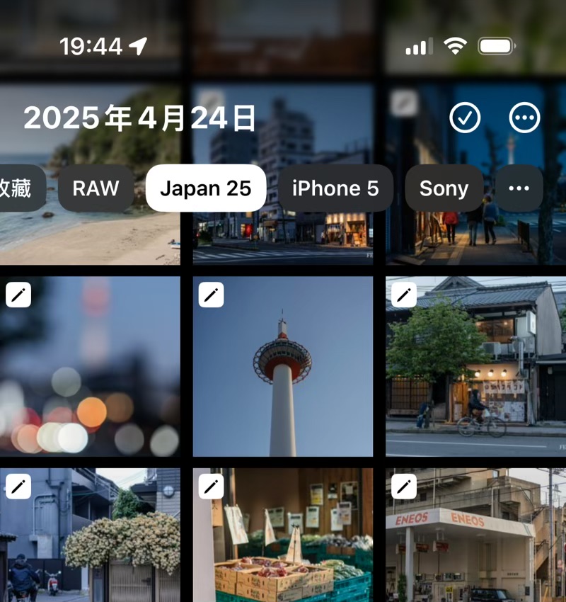 如果一个照片包含了编辑参数,那么图库页面的左上角会有一个新的图标。长按一个照片来复制编辑参数。