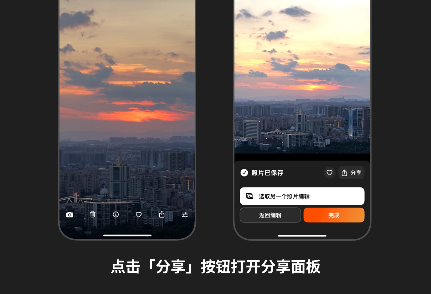 - 在编辑完一个 HDR 照片后,点击下方的「分享」按钮;