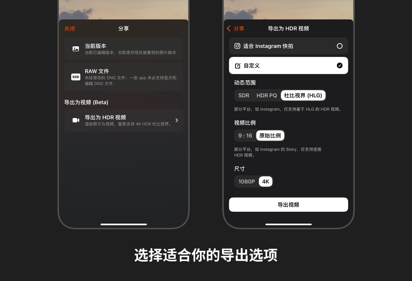 导出的视频将会是该照片的静止画面,使用上传到支持 HDR 视 频的平台,如 Instagram,小红书或抖音。之所以提供不同的导出选项,是因为不同平台支持的 HDR 格式以及视频规格不完全一致。以下是我根据我的使用经验得出的结论: