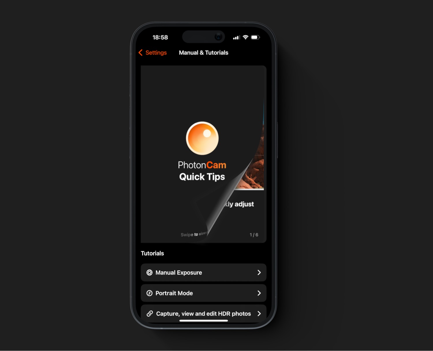 PhotonCam app 內有手冊 & 教程頁面。请到「設置」-「手冊和教程」頁面以查看應用內手冊。